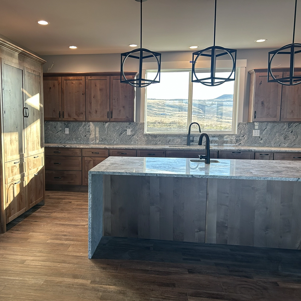 This kitchen upgrade features custom granite countertops throughout, anchored by a waterfall island that creates a bold focal point. A full-height granite backsplash extends to the cabinets, with the window cleanly inset into the stone for a seamless, custom finish.