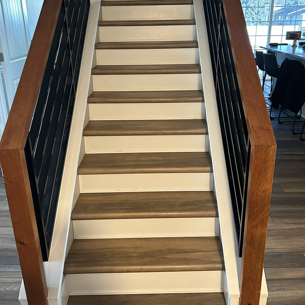 These stairs feature Shaw luxury vinyl plank solid treads with white face risers for a clean, modern contrast.