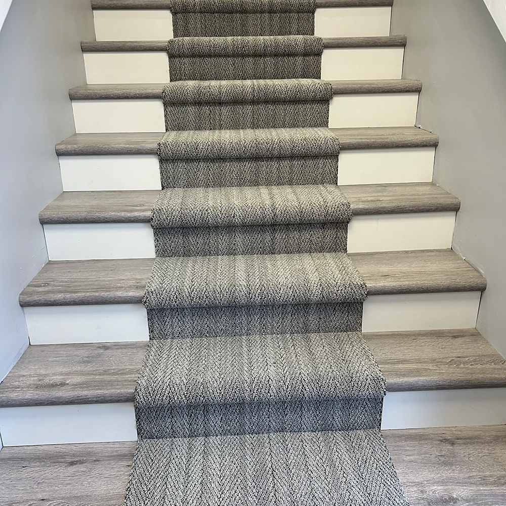 This staircase features patterned carpet runners centered between luxury vinyl plank stair treads, finished with white face risers.