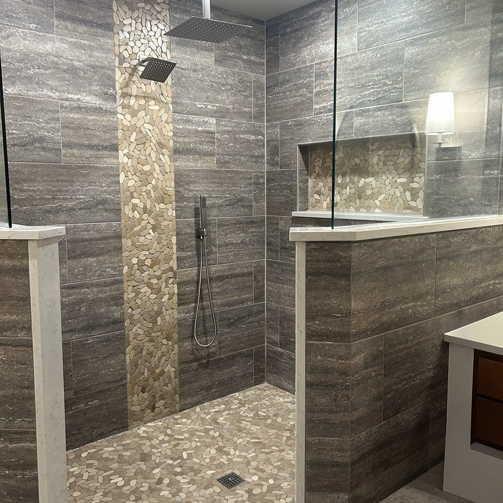 This walk-in shower features 12×20 porcelain tile, a natural rock mosaic accent strip, and a matching mosaic shower floor, with pony walls and the niche capped in white quartz to coordinate with the vanity.