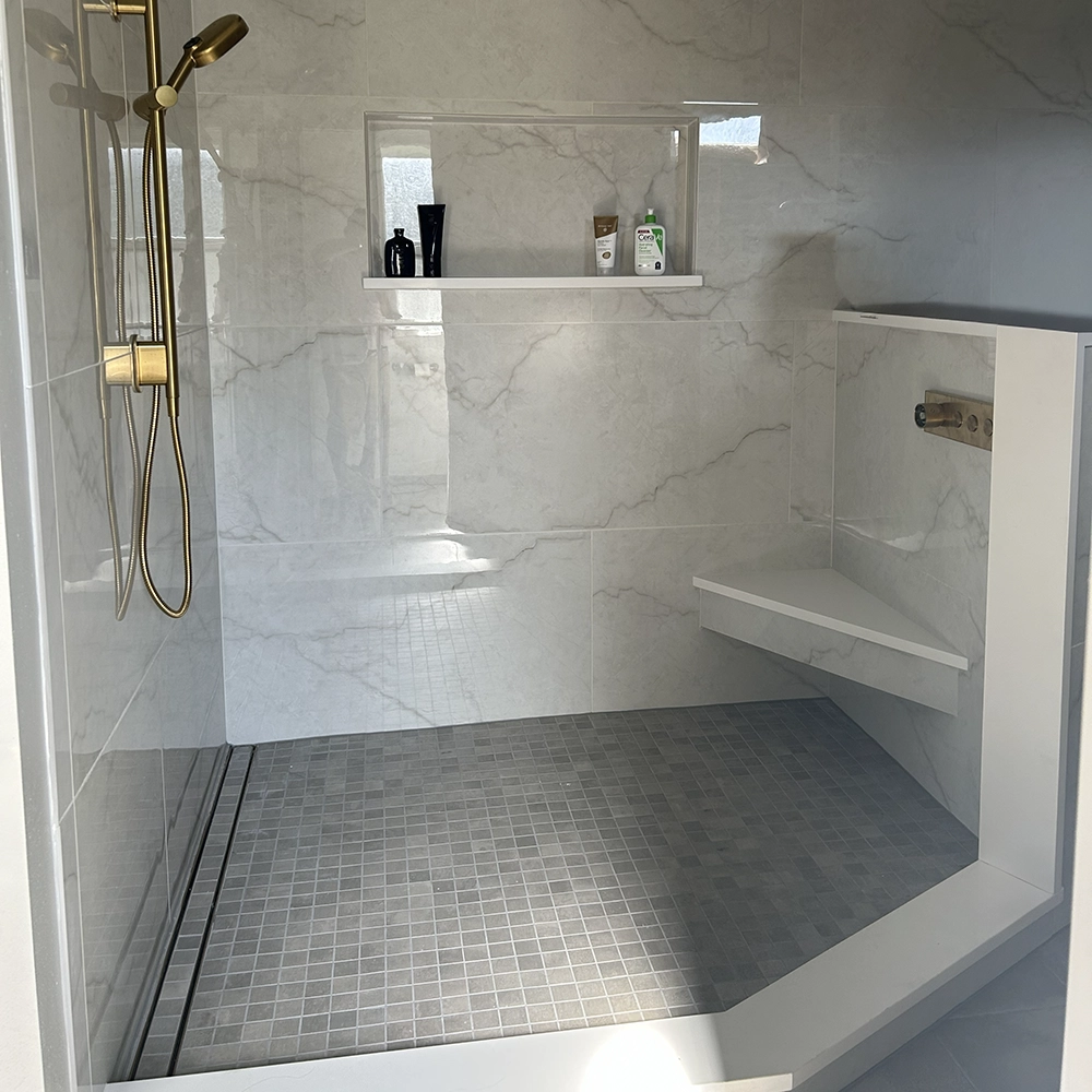 This walk-in shower features 24×48 porcelain tile on the walls with a corner bench capped in quartz for a clean, modern finish.