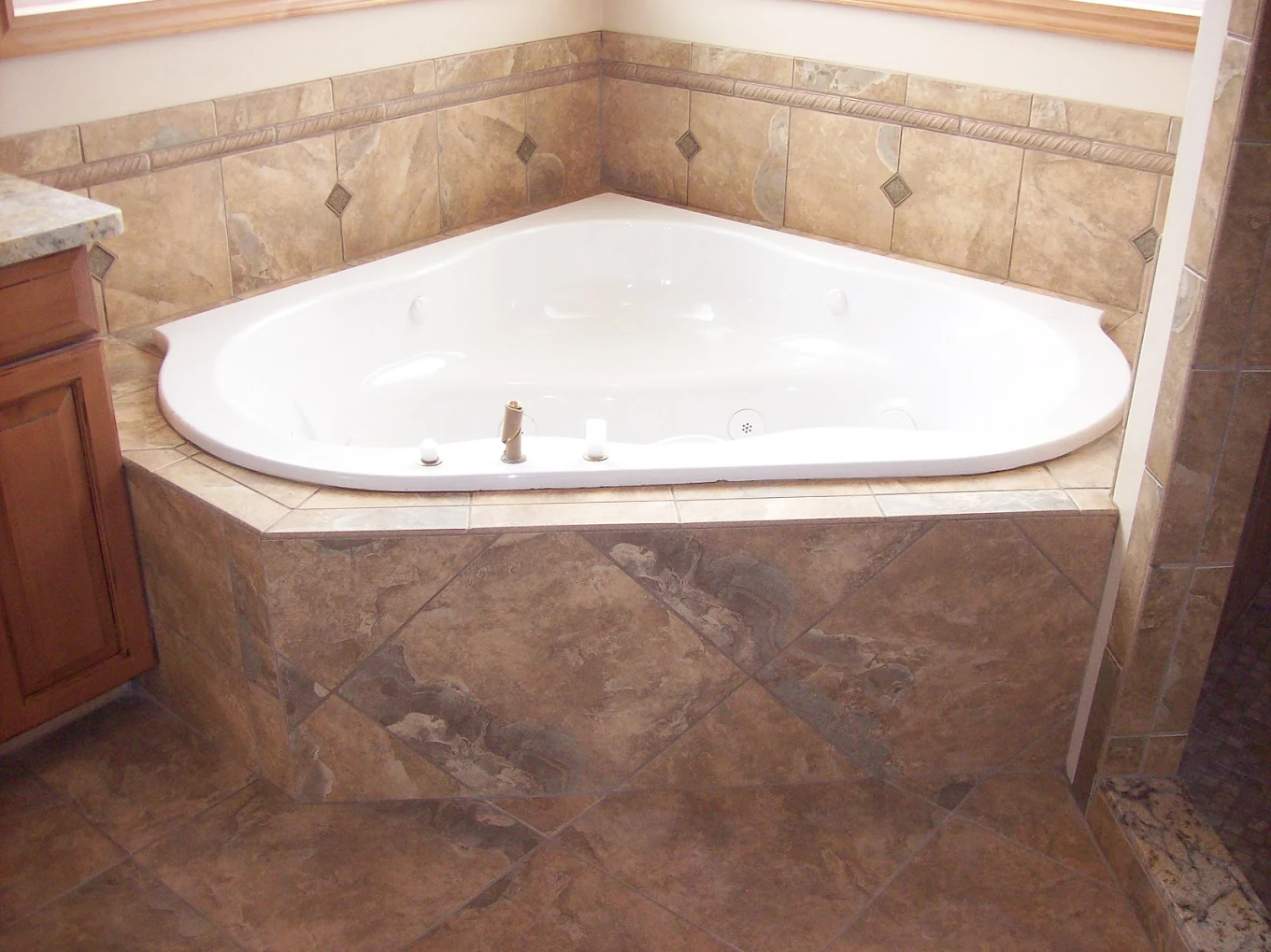 This corner soaking tub is set into a custom tiled deck with matching tile surround and decorative accent detailing.