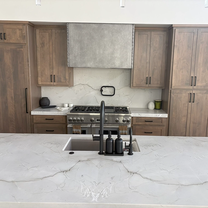 Full quartzite backsplash for a seamless, modern finish